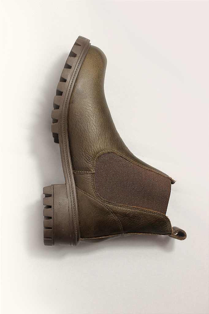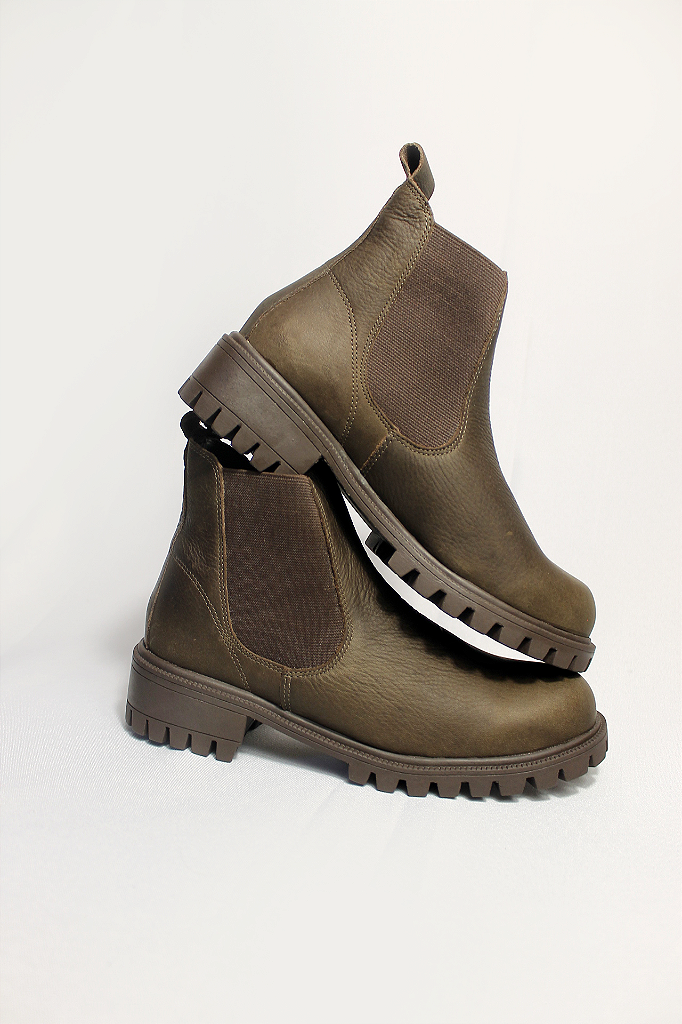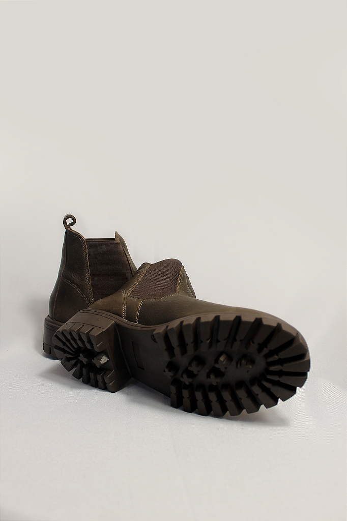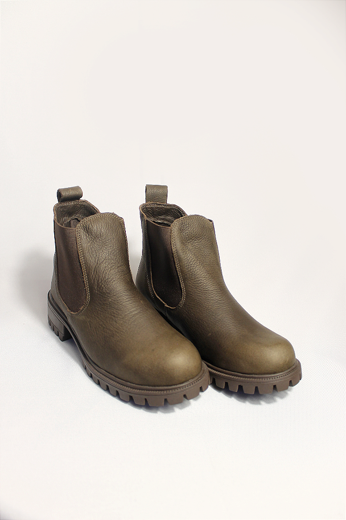 Botina de couro verde oliva, com solado tratorado na cor chocolate, que irá trazer modernidade e conforto, em qualquer momento do seu dia.