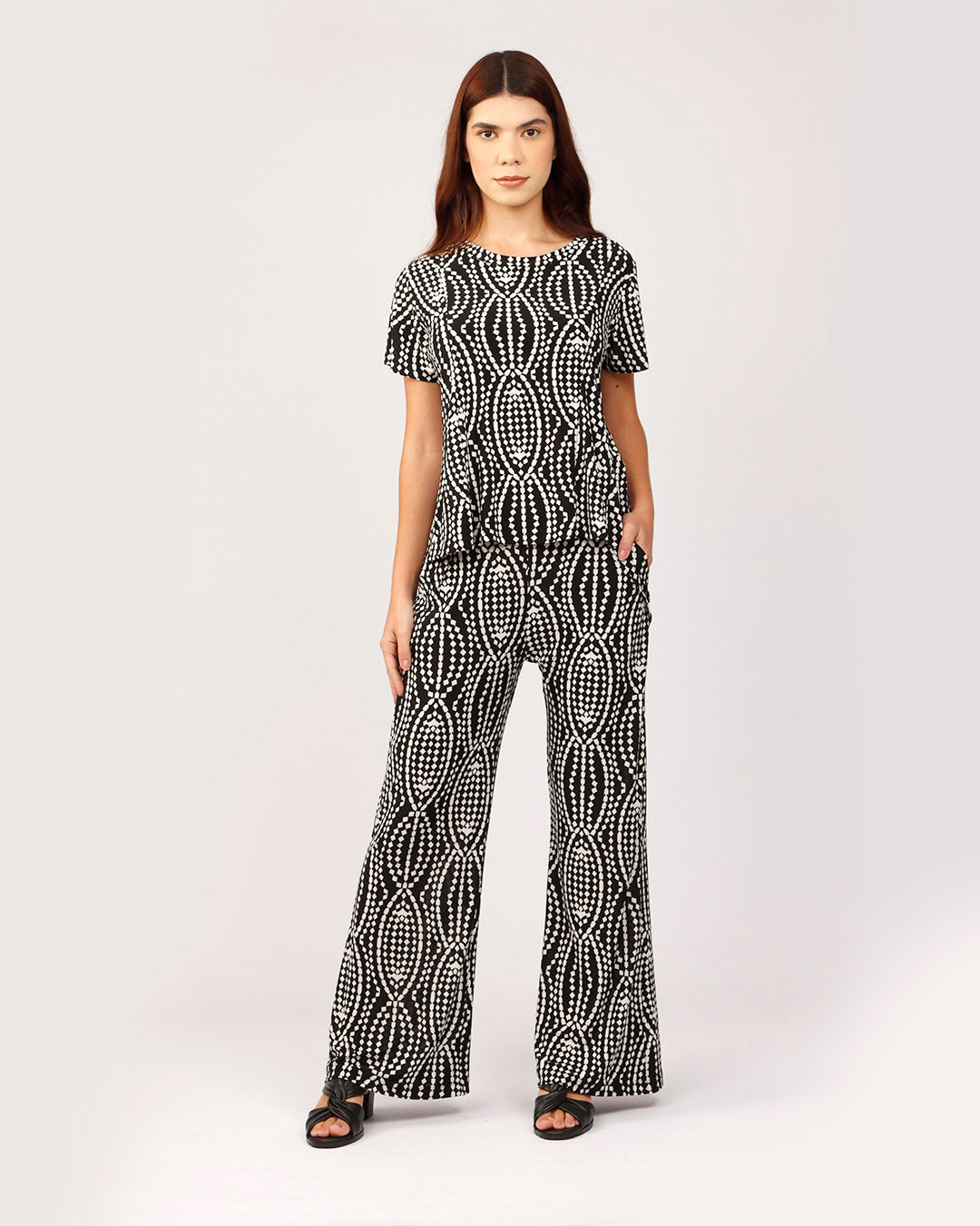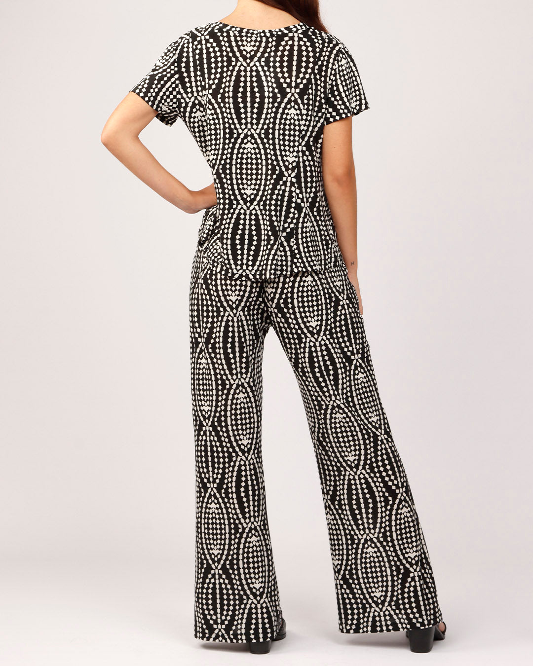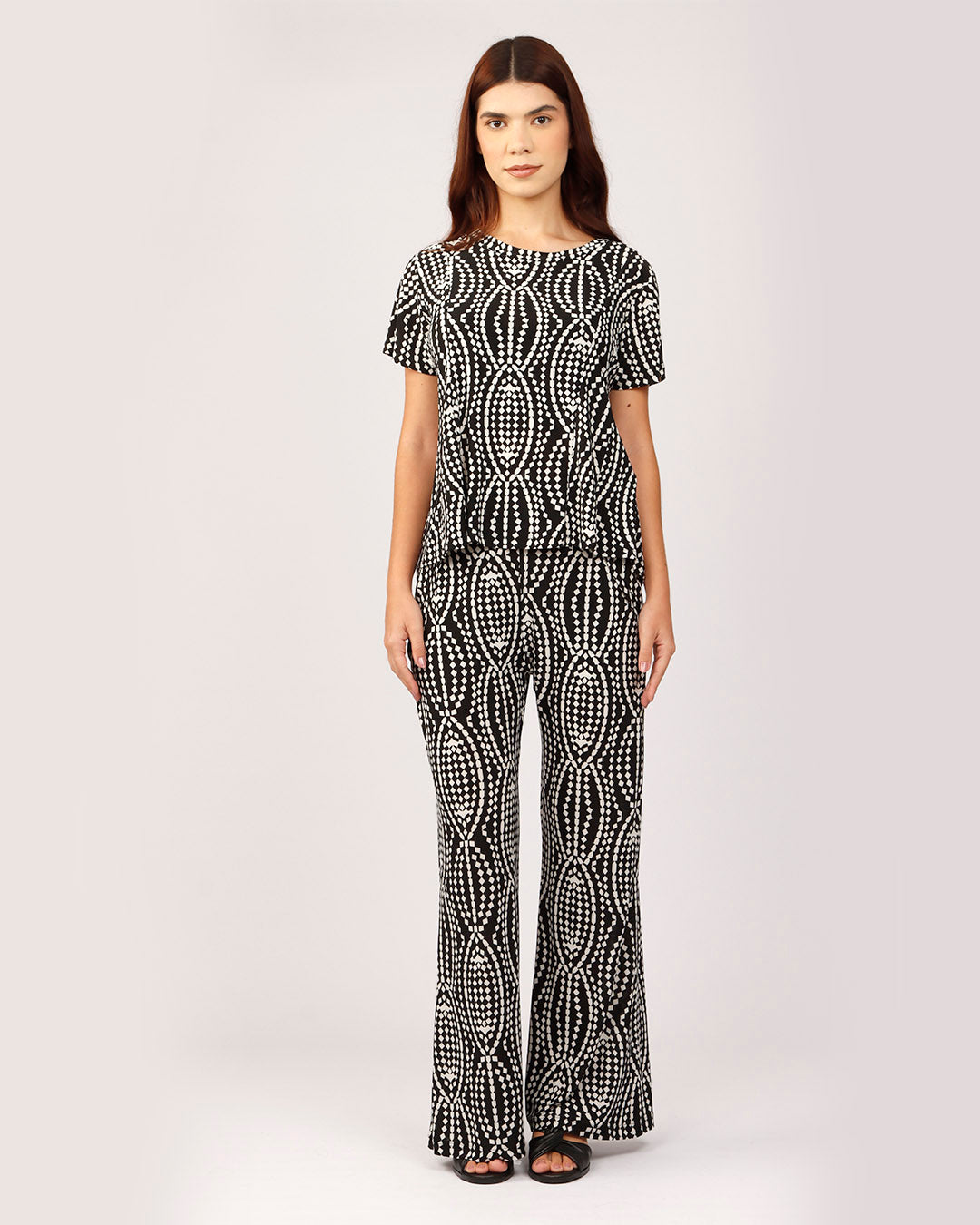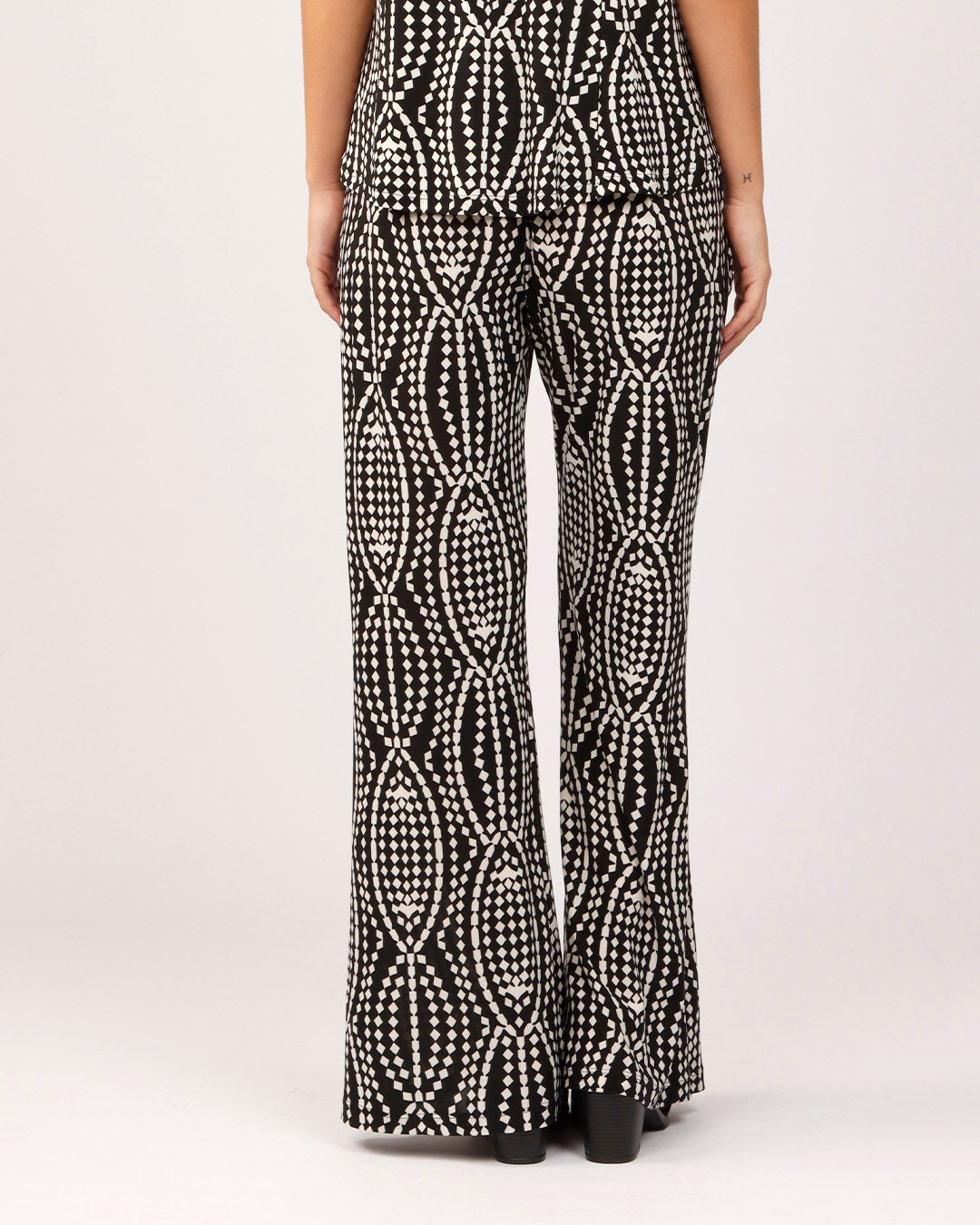 Elegância e conforto se encontram nesta calça pantalona com um visual moderno e marcante. A peça apresenta uma estampa geométrica em preto e branco, composta por padrões de elos entrelaçados que criam um efeito visual dinâmico e sofisticado.