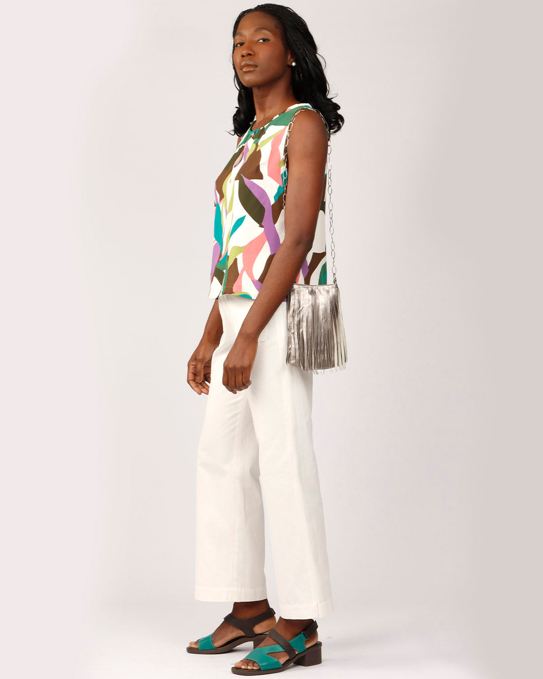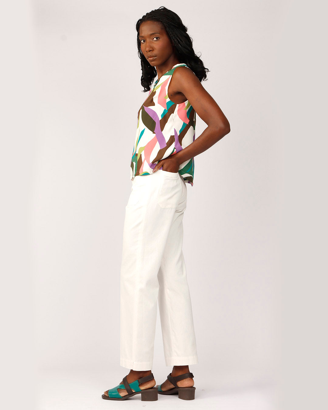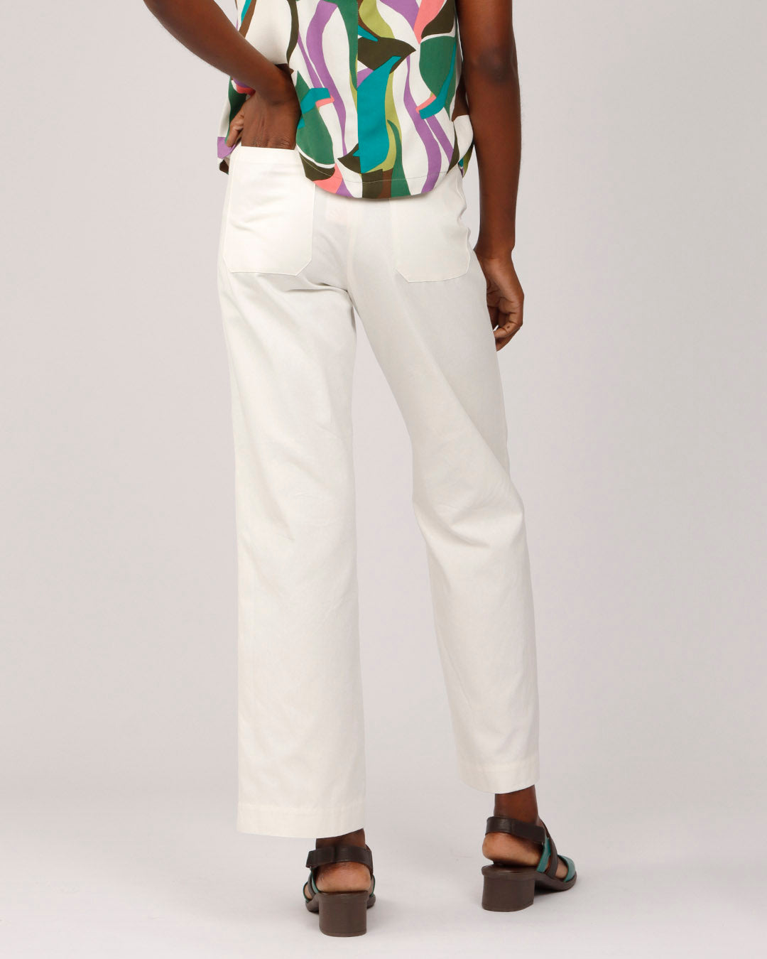 Aposte no conforto e na praticidade com esta calça feminina feita em algodão. com modelagem reta e caimento leve, ela oferece liberdade de movimento e um toque macio ao vestir. O cós conta com fechamento por botão e zíper, garantindo ajuste seguro. Na parte frontal, possui bolsos discretos que trazem funcionalidade ao dia a dia. Já na parte de trás, apresenta dois bolsos aplicados que adicionam charme ao visual.