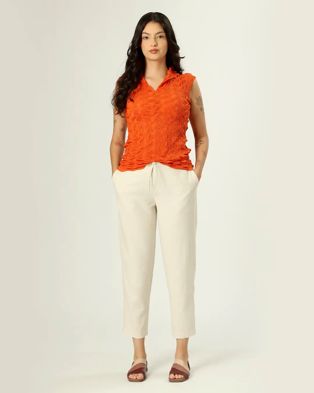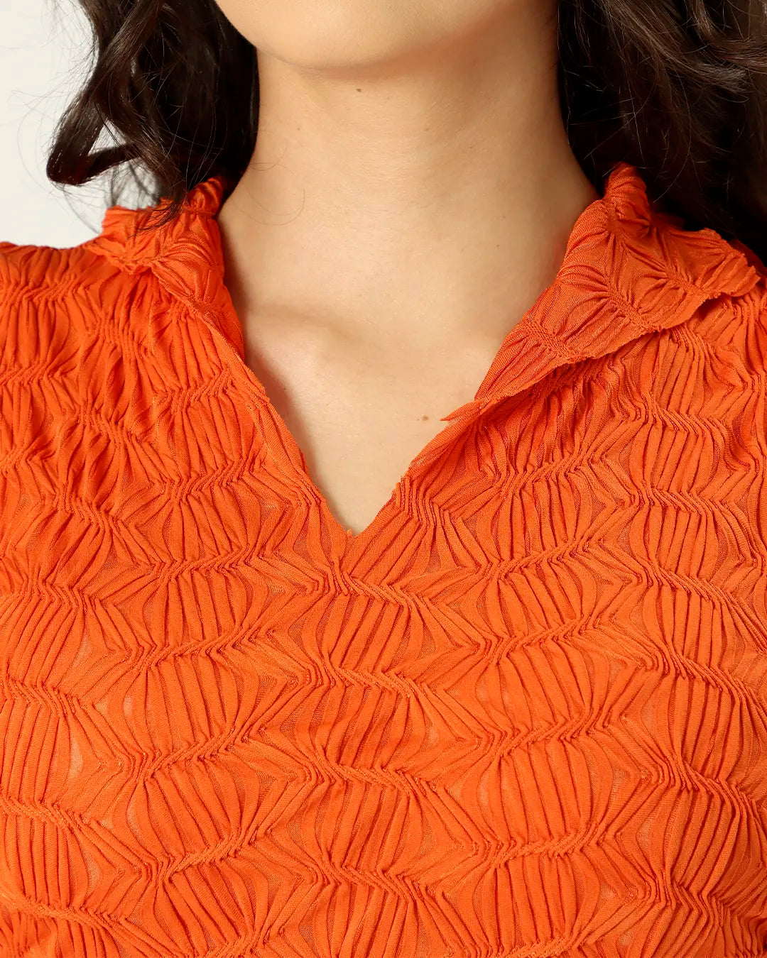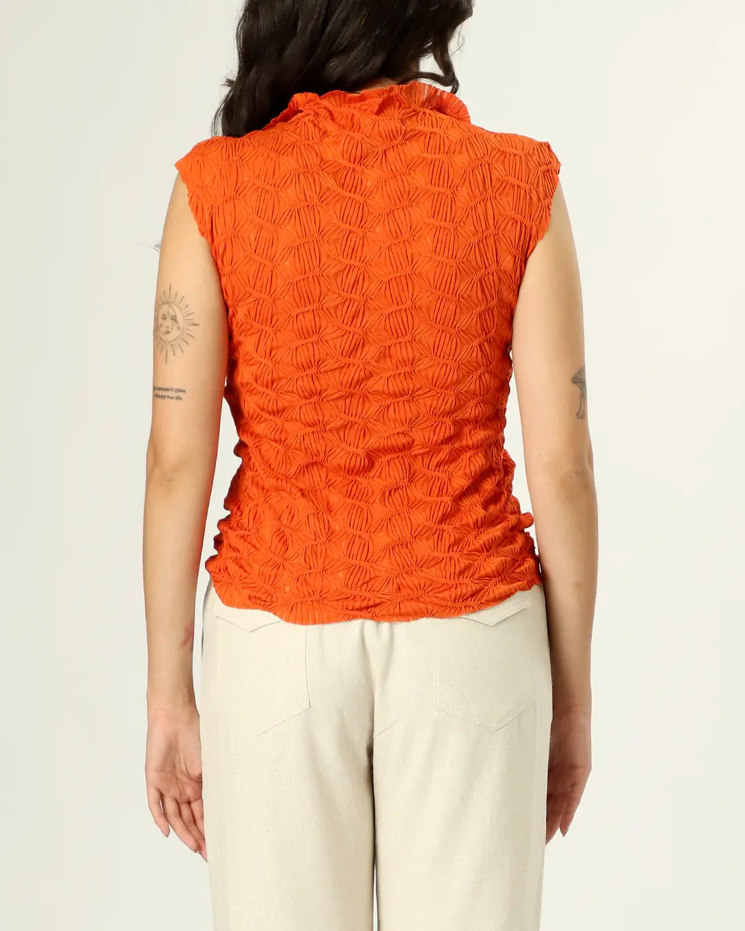 Blusa confeccionada em tecido leve com toque macio e caimento fluido. O destaque está no trabalho texturizado em efeito 3D, que garante modernidade e sofisticação à peça. Possui decote V, gola drapeada e manga estilo cavada, que deixa a peça confortável e despojada. Ideal para composições casuais ou sofisticadas, podendo ser usada tanto com jeans quanto com saias ou calças de alfaiataria. Disponível em duas cores: verde e laranja vibrante.