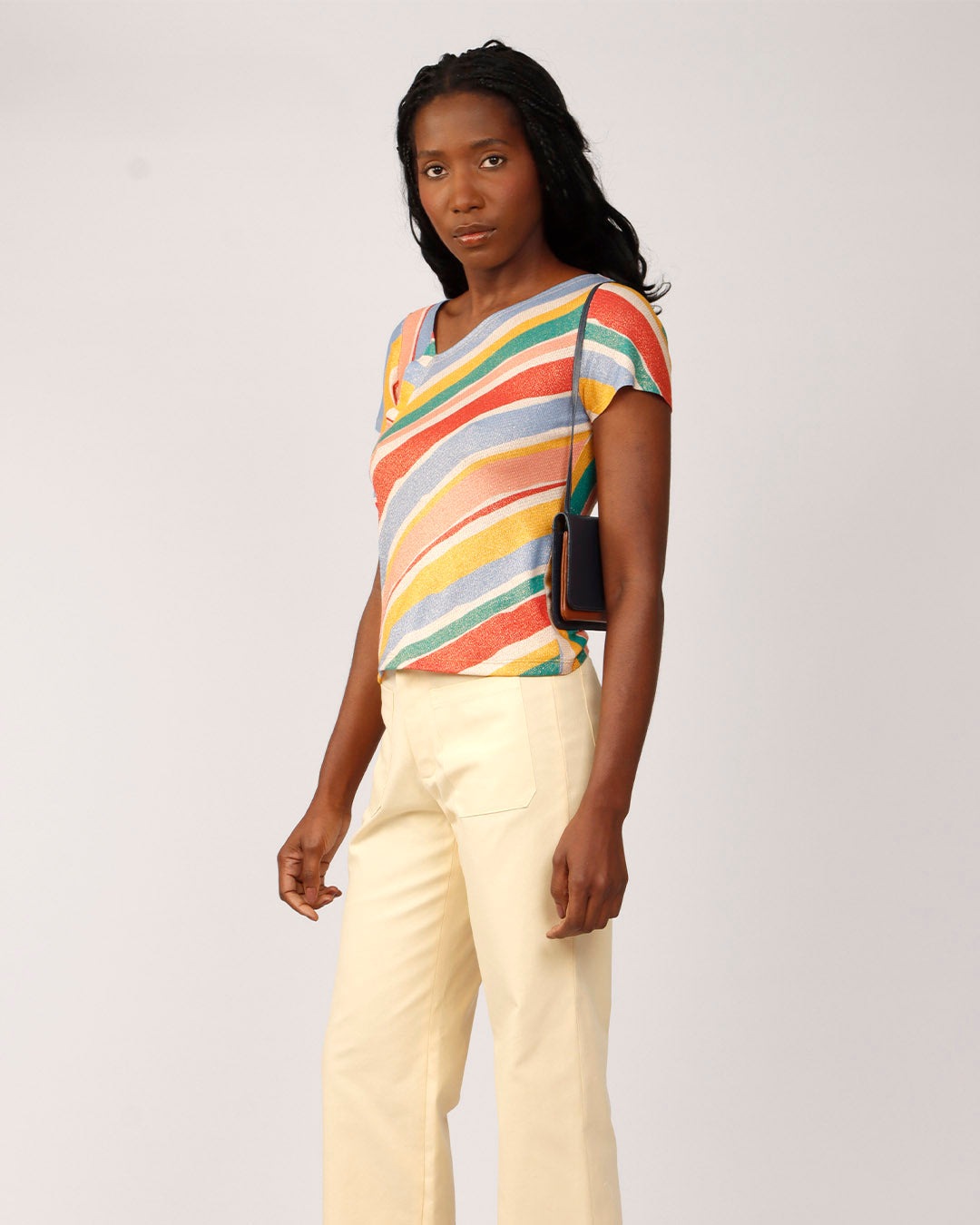 O design em listras coloridas deixa o look vibrante e versátil, funcionando tanto para composições casuais quanto para produções mais arrumadinhas. Uma peça fácil de combinar com zero transparência.