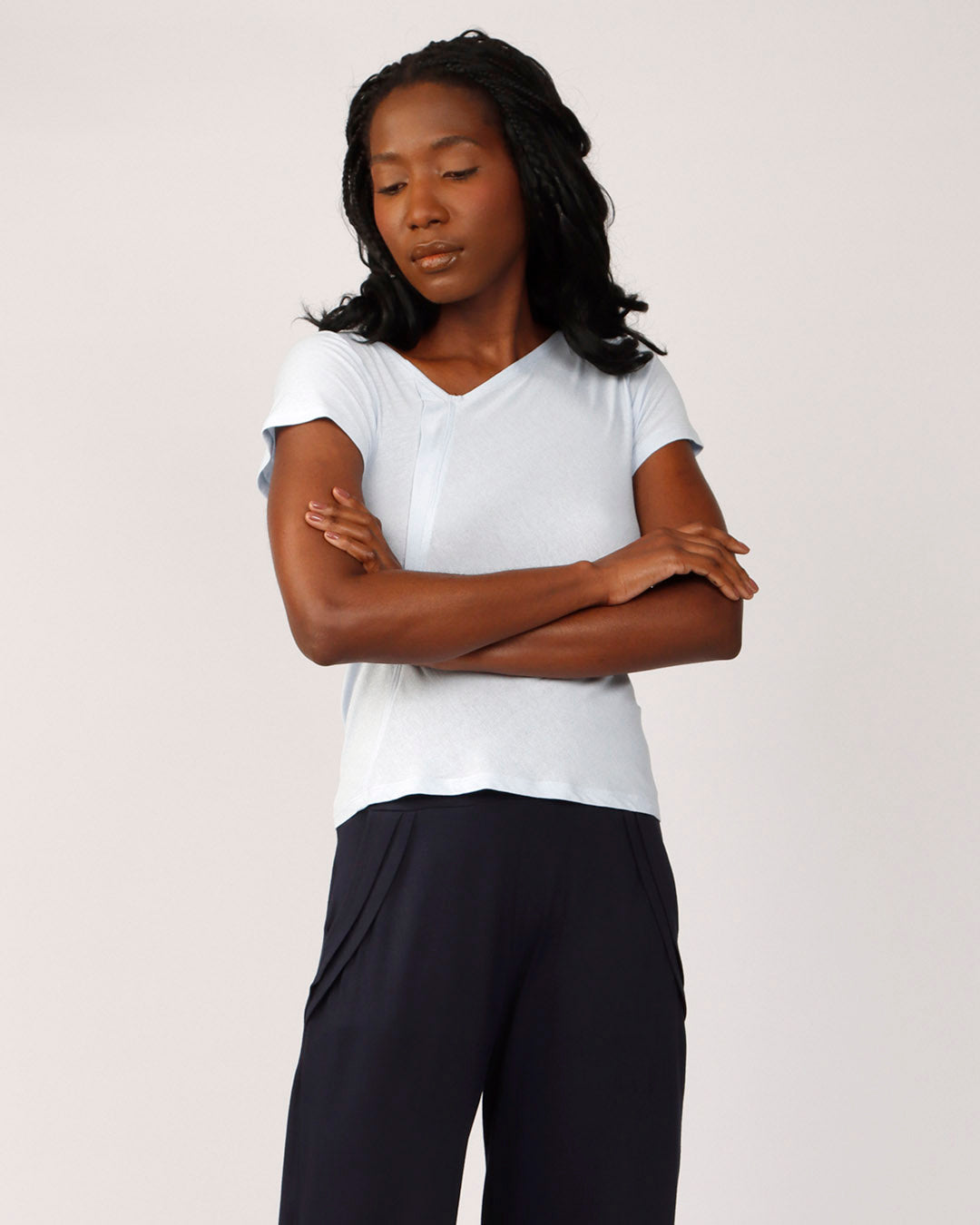 Essencial no guarda-roupa, esta blusa básica é sinônimo de conforto e versatilidade. Confeccionada em um tecido de malha leve e toque macio, ela proporciona um caimento suave e fresco ao corpo. O decote em V valoriza o colo de forma discreta e elegante.