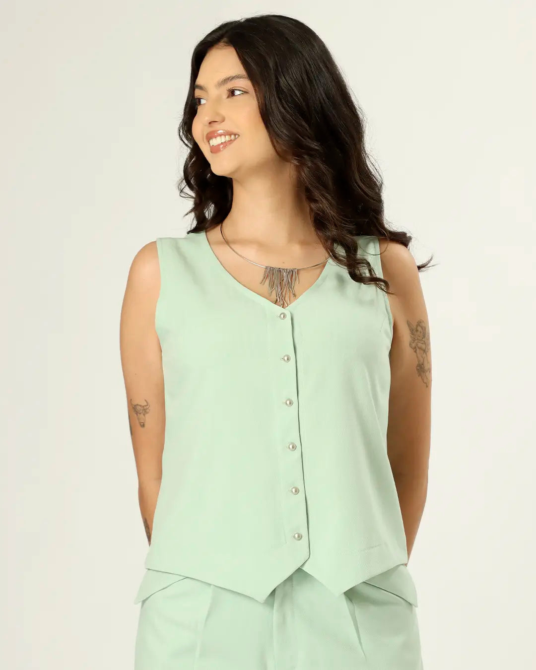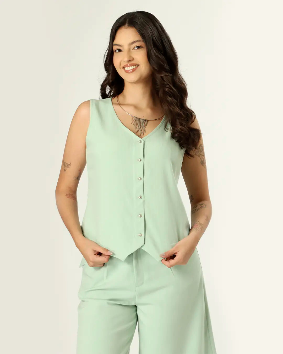 Esse colete, feito em tecido plano, chegou para ser o destaque do seu guarda-roupa de Verão.
