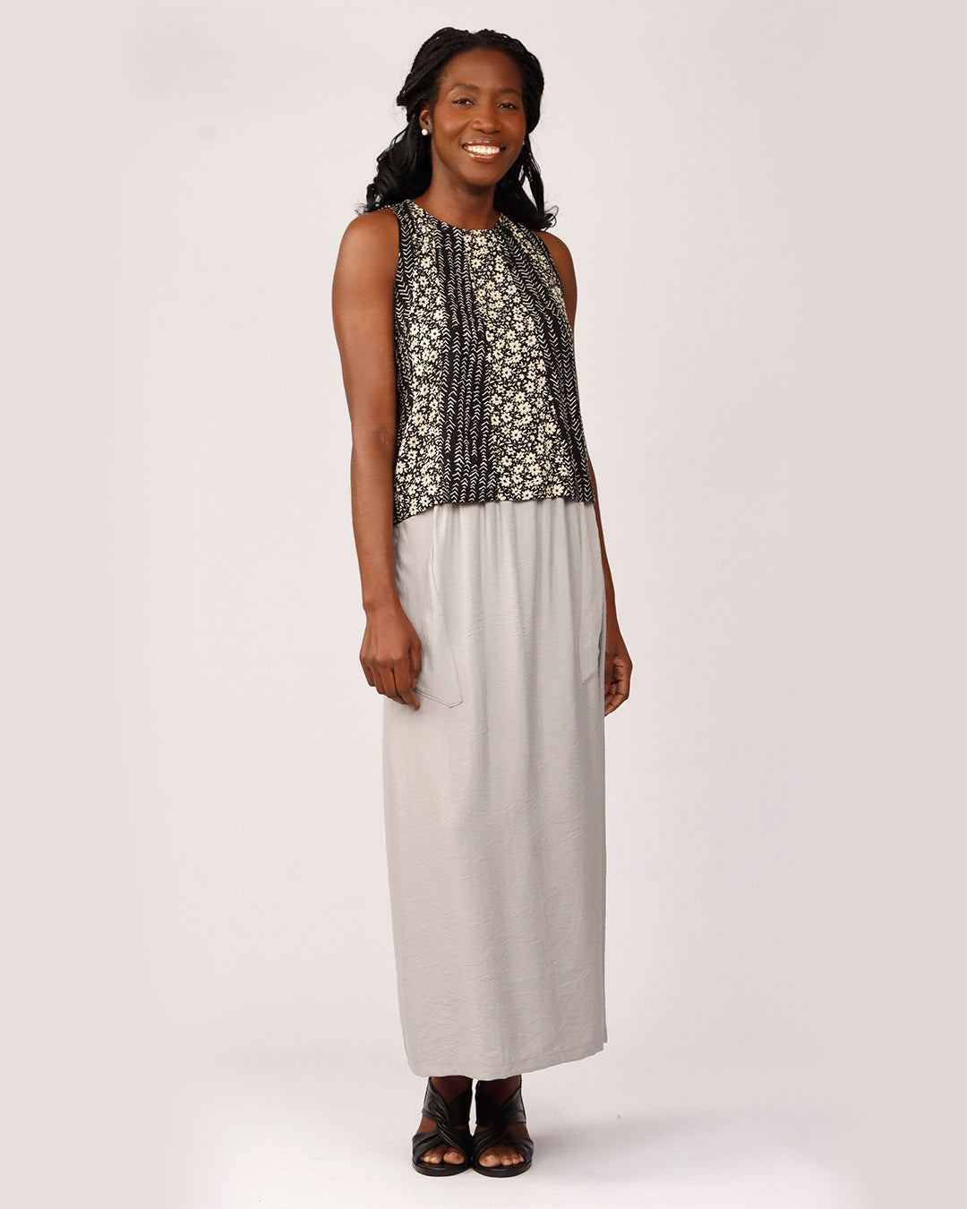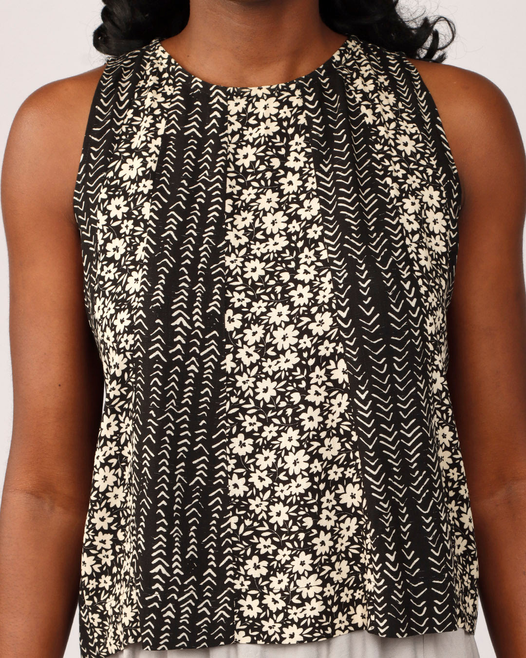 Essa regata é uma peça cheia de personalidade, ideal para quem busca um visual moderno e confortável. O destaque fica por conta do mix de estampas em preto e branco/bege: padrões geométricos que simulam listras em "V" nas laterais e um delicado floral na parte central.