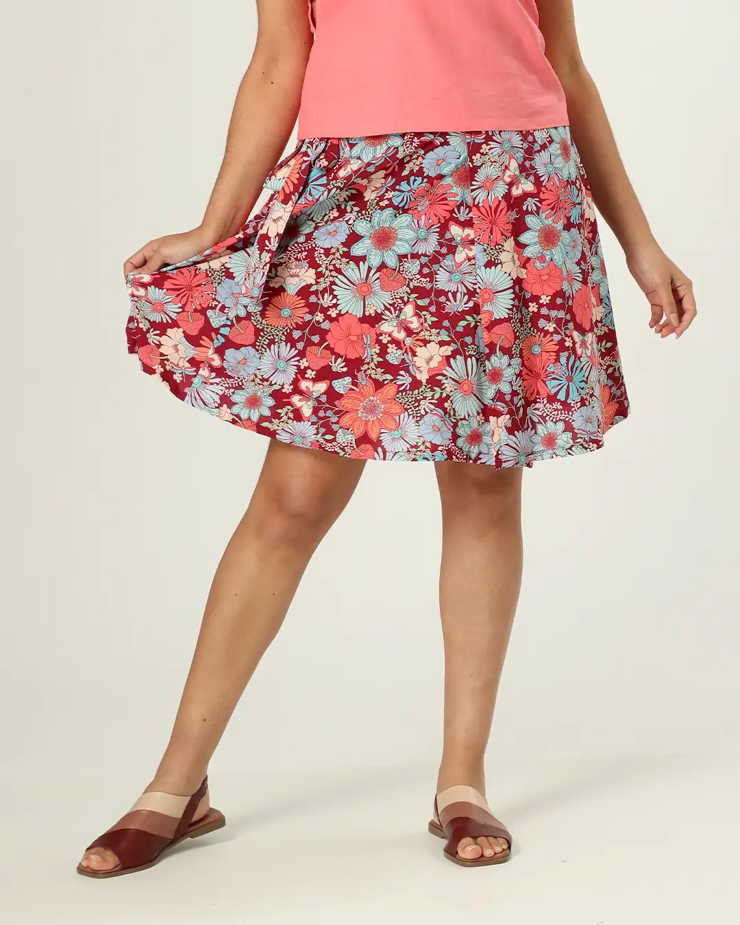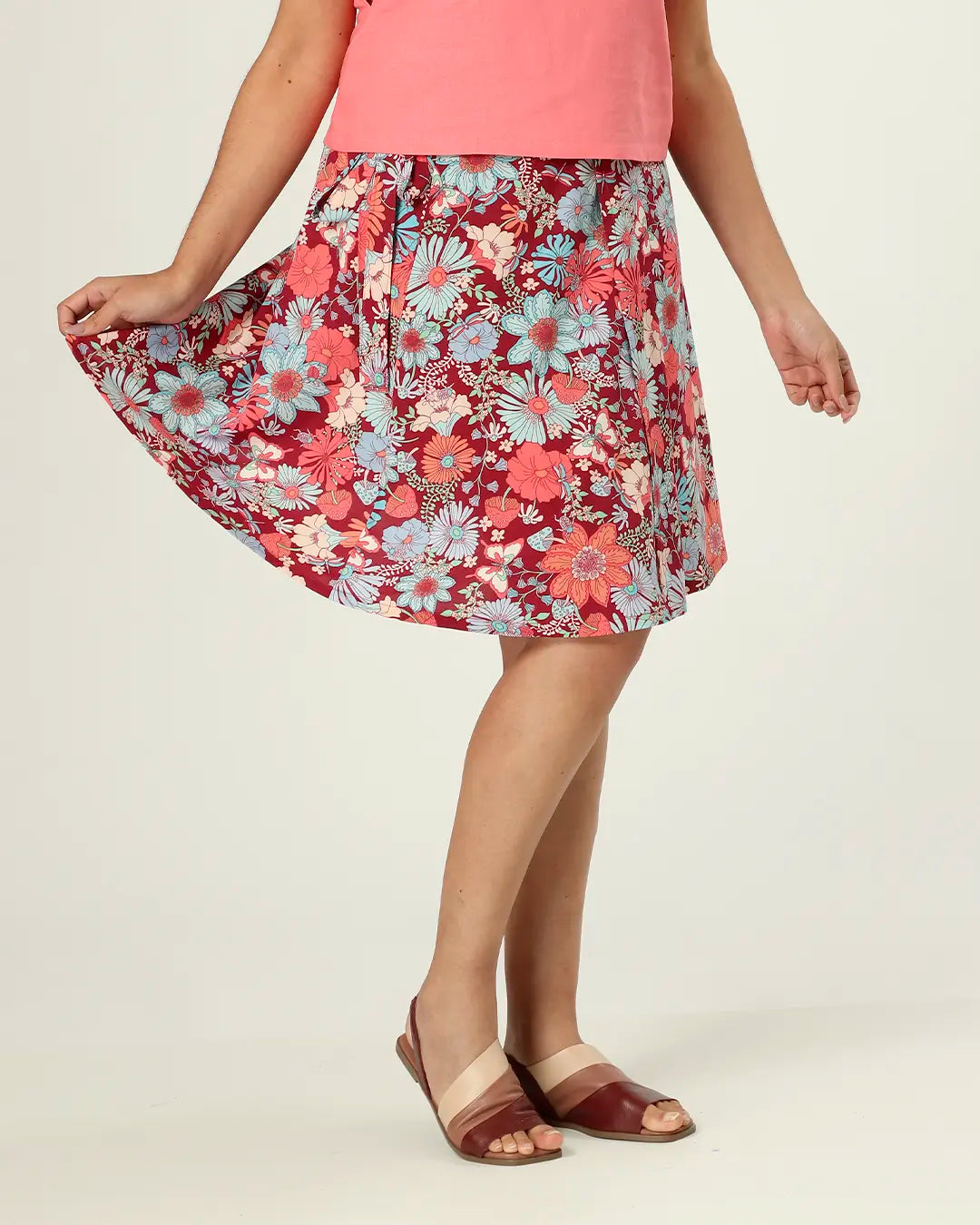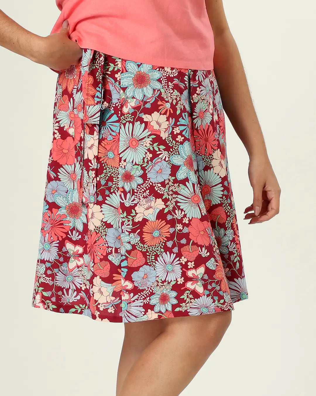 Saia transpassada com estampa floral vibrante em fundo vinho, trazendo um ar alegre e feminino para o look. O caimento é leve e confortável, em tecido que não amassa, garantindo praticidade no dia a dia e elegância em qualquer ocasião. Uma peça curinga que transita facilmente entre combinações casuais ou mais sofisticadas.