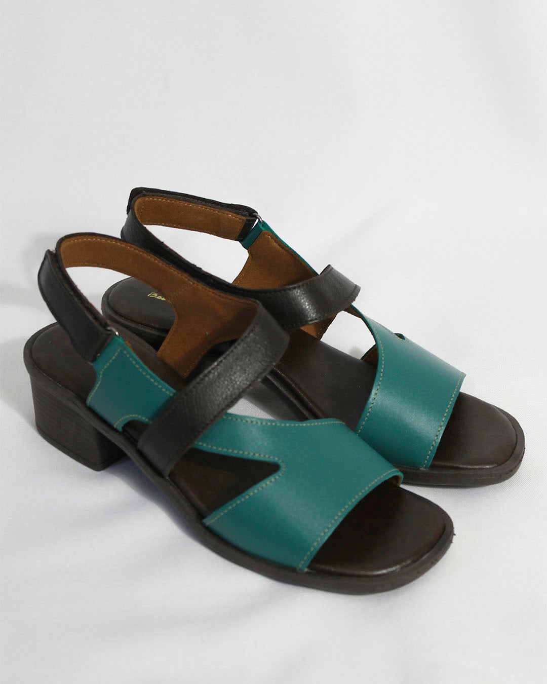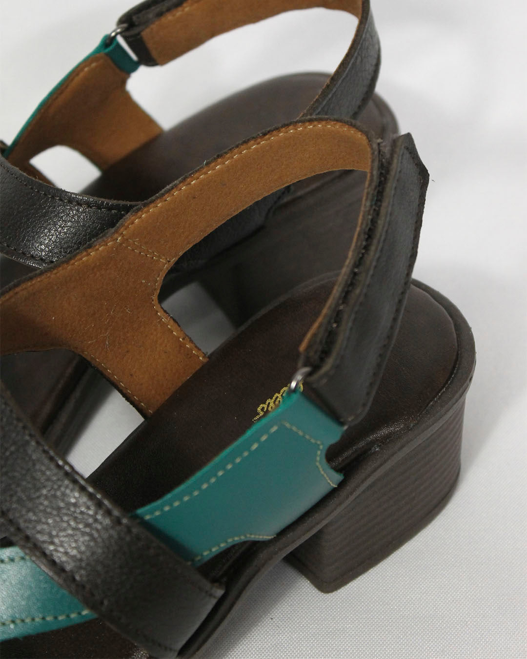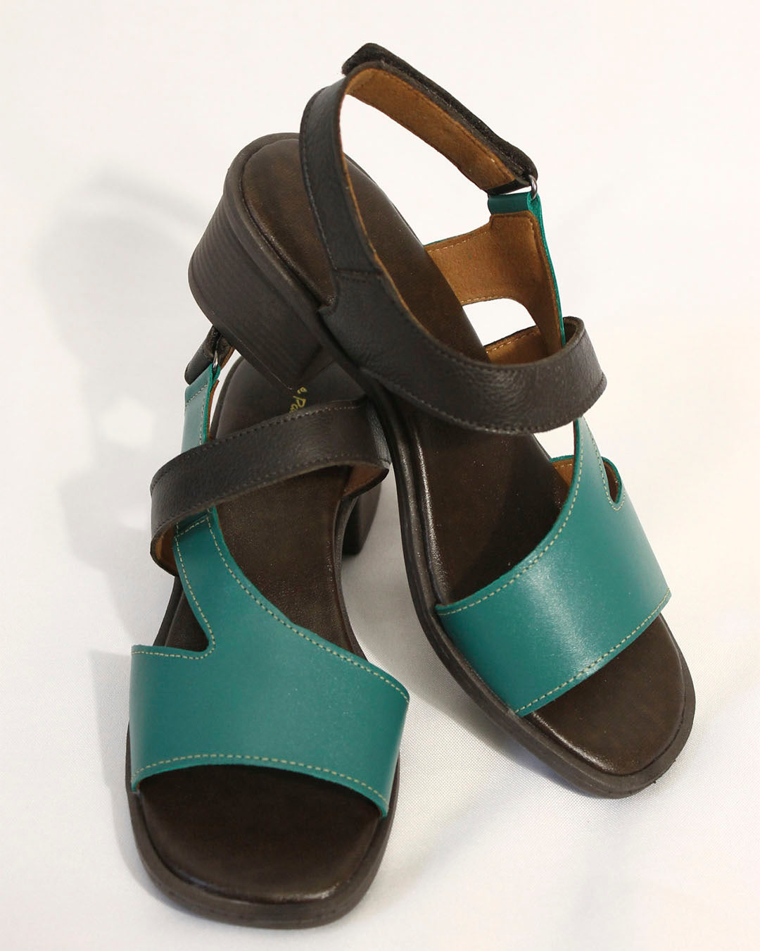 Sandália verde petróleo com tiras marrons, fechamento em velcro e salto de 4,5cm confortável, Que garante elegância na medida certa sem abrir mão do conforto. Estilosa pratica para o dia a dia, une modernidade e bem-estar em cada detalhe.