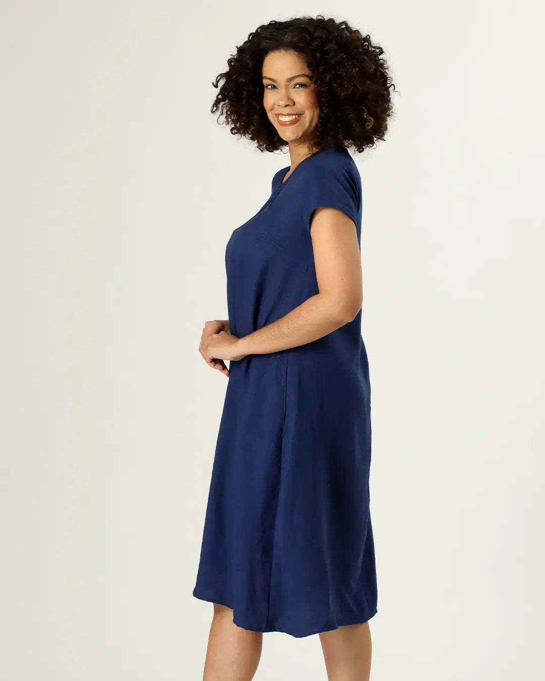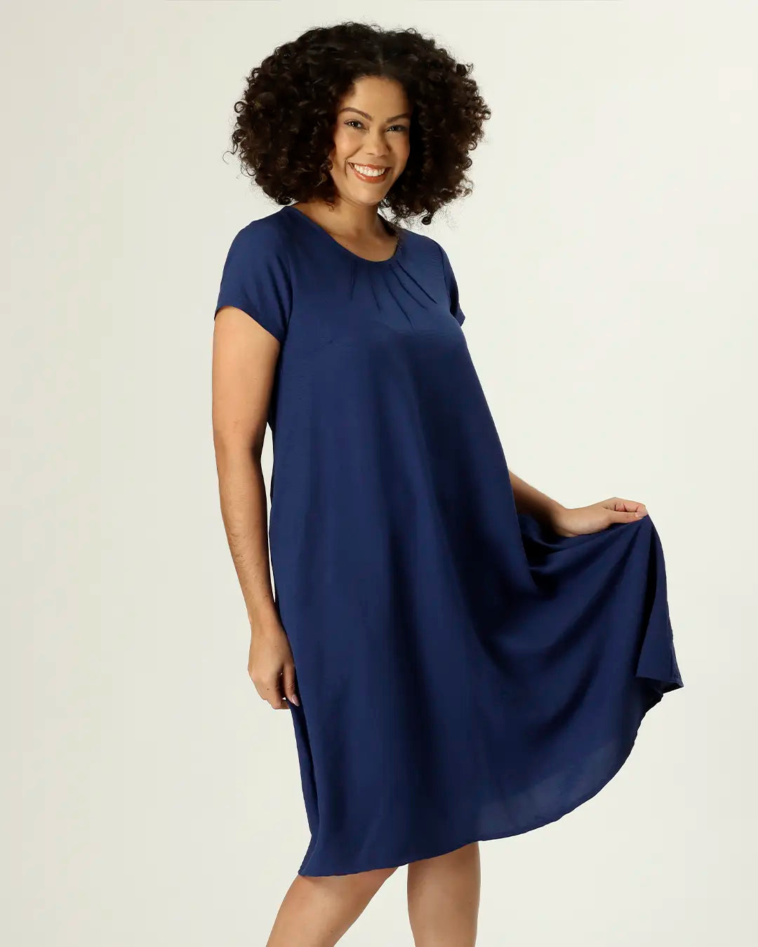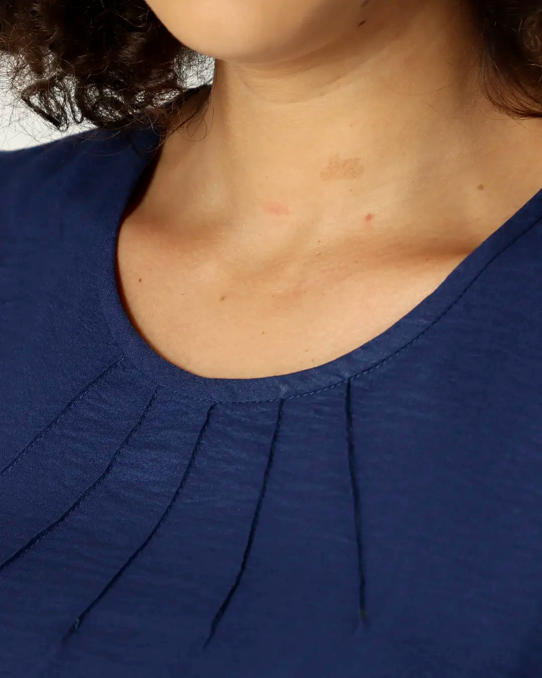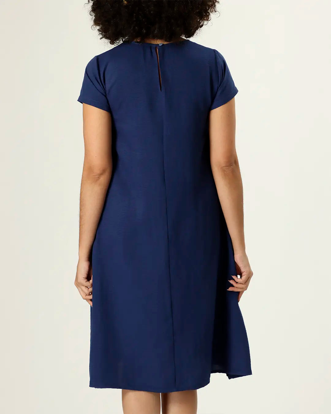 Conforto e leveza em uma peça maleável, esse vestido é confeccionado em tecido texturizado, estilo creponado, não amassa com facilidade e seca rápido, de caimento leve, que proporciona movimento e frescor ao look. Possui modelagem soltinha, mangas curtas e detalhe de pregas sutis no decote redondo,com detalhe assimétrico nas laterais, que cria movimento e alonga a silhueta. Ideal para o dia a dia ou ocasiões especiais. Disponível em três cores: azul, verde e bordô.