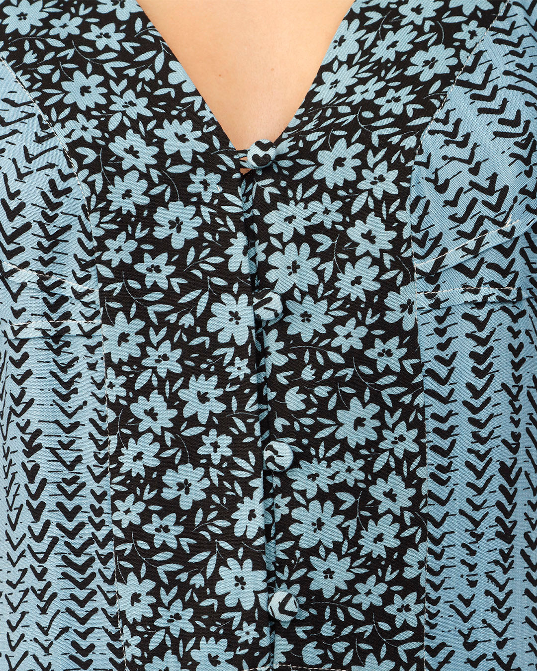 Vestido curto confeccionado em viscose leve e confortável, ideal para o dia a dia. Possui estampa geométrica em preto, com detalhes florais contrastantes na gola, busto e bolsos frontais, que trazem um toque artesanal e delicado à peça. O modelo tem corte V, mangas curtas ligeiramente bufantes e modelagem soltinha, que valorizam o corpo sem marcar. Peça versátil, perfeita para combinar com opções, rasteiras um até um tênis casual.