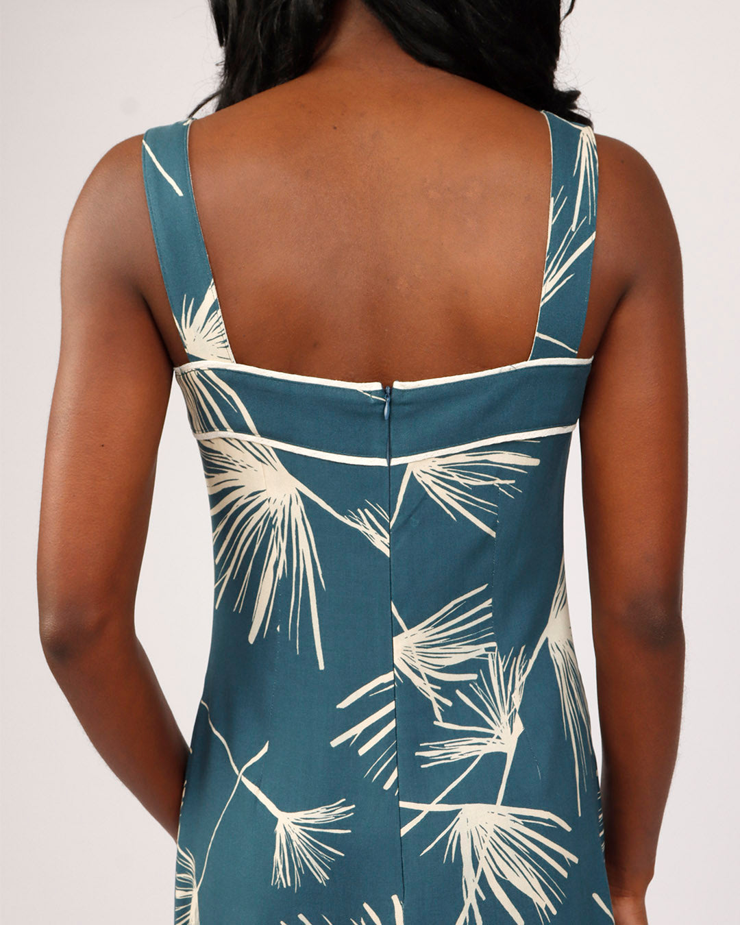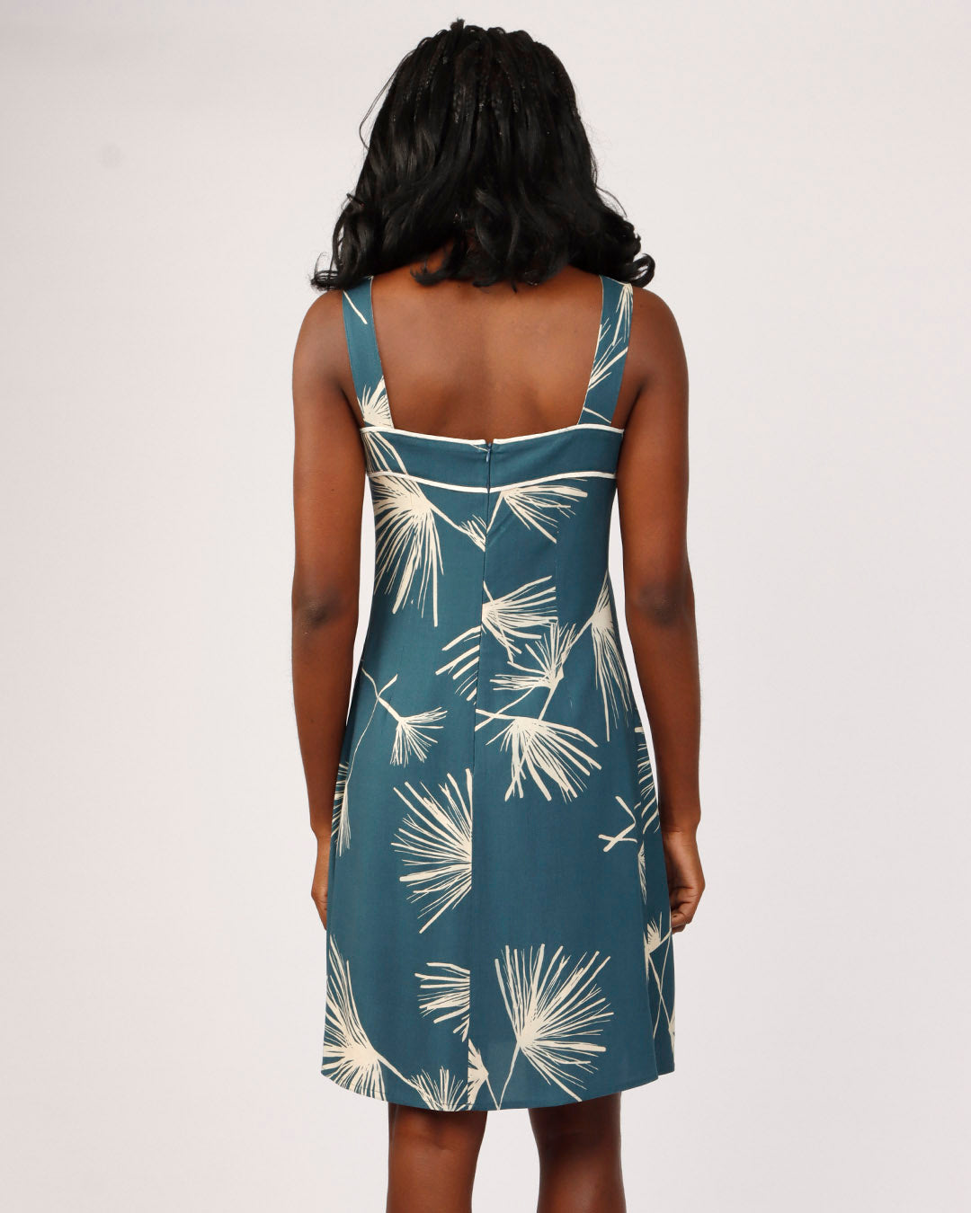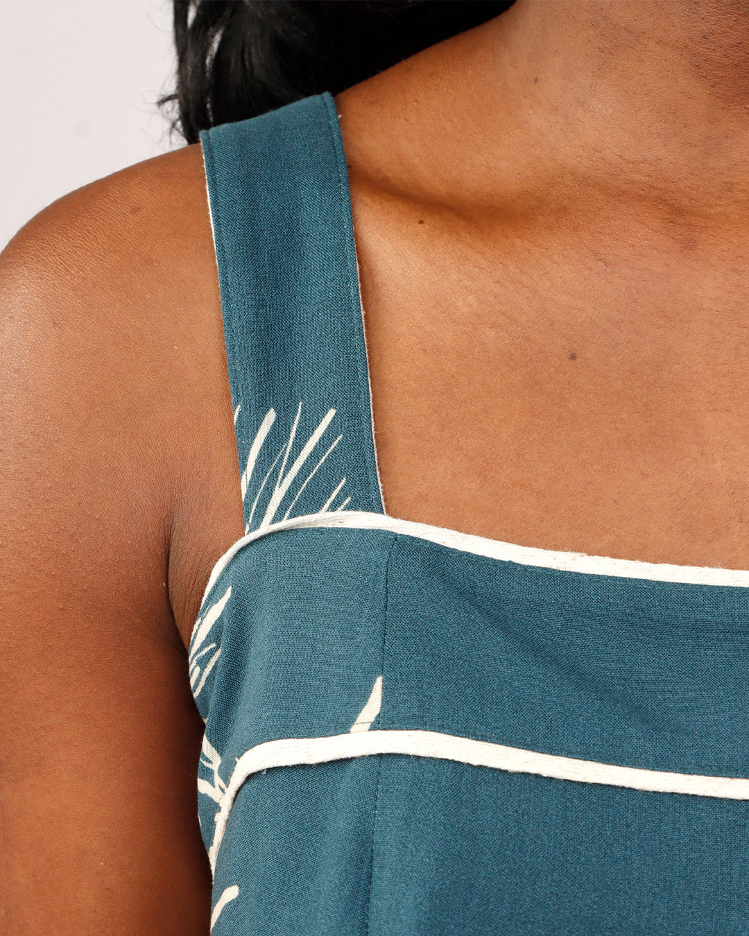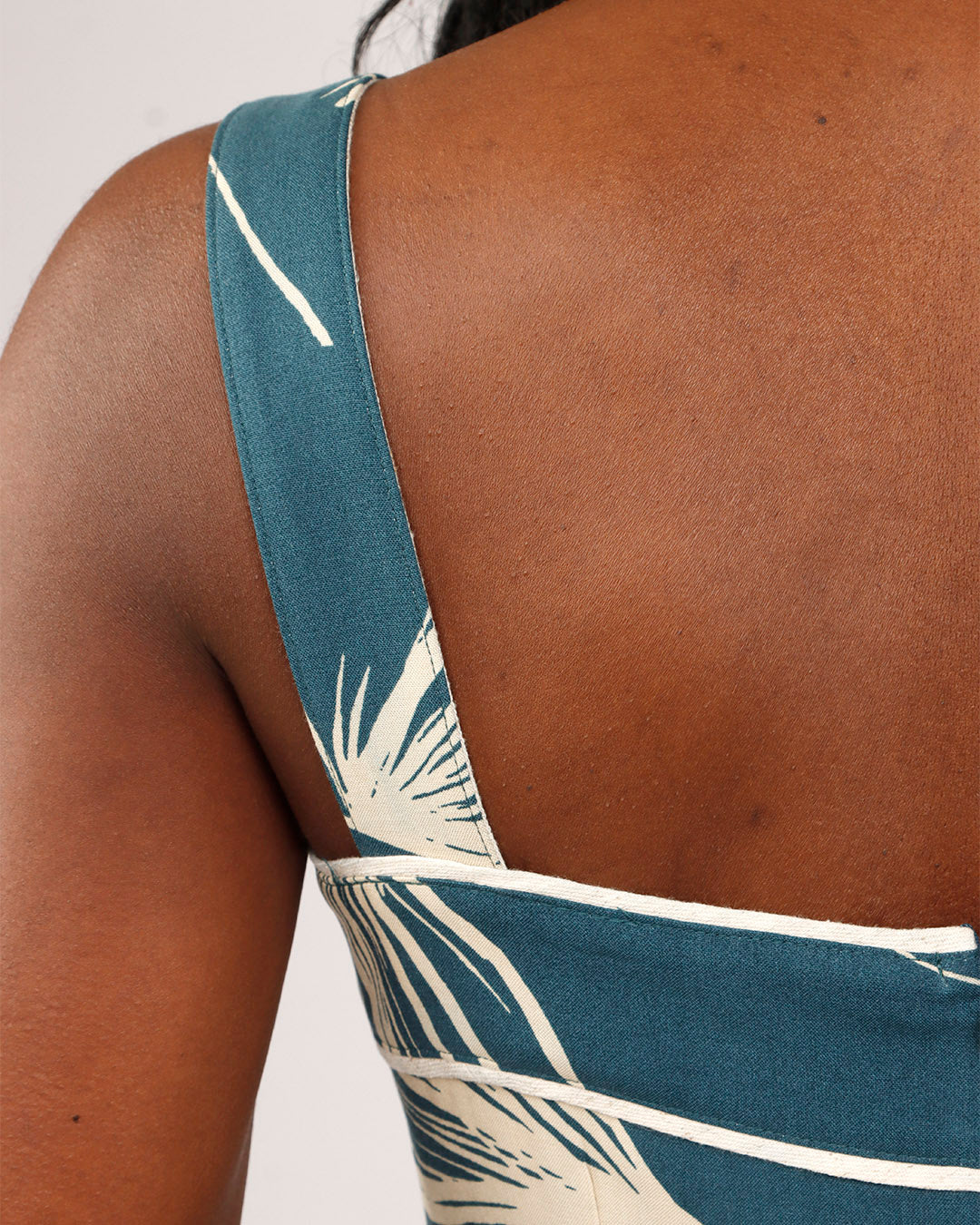 A estampa moderna em folhagens claras sobre o fundo azul petróleo adiciona um toque sofisticado, ideal para quem ama um visual estiloso sem perder a suavidade.